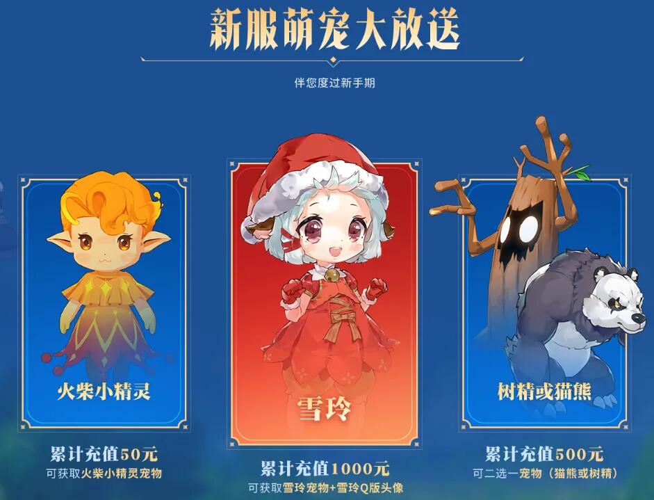 新的冒险值得新的相遇与陪伴,活动期间,累计充值达到不同额度,即可领取到火柴小精灵宠物、猫熊和树精宠物(2选1)、以及超萌雪玲宠物(与Q版头像)!